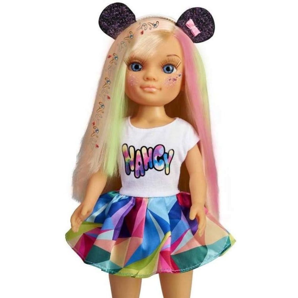 - Muñeca Nancy de 42 cm de altura y pelo rubio largo, lleva un vestido con una falda de colores y unos zapatos rosas.
