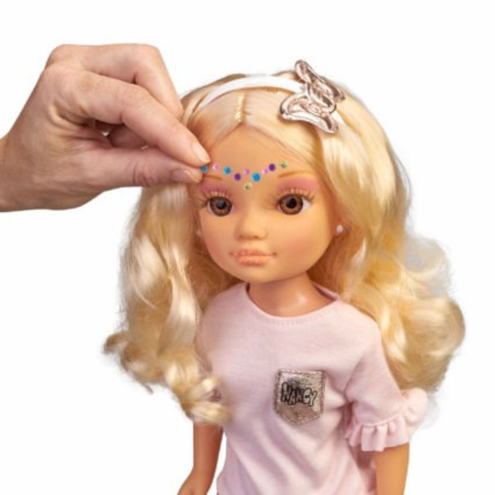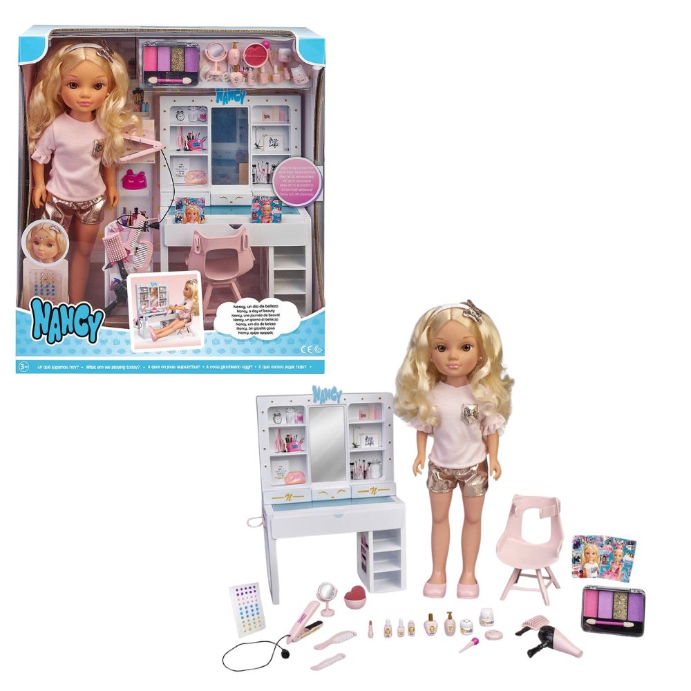 • El set contiene un tocador y una banqueta con soporte para poder sentar y sujetar a la muñeca y más de 20 accesorios para jugar a peinar y maquillar a Nancy.
