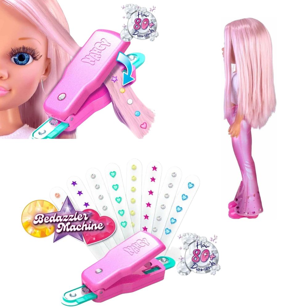 - Este set incluye una máquina de gemas para pegar los brillos al pelo de tu muñeca y muchos accesorios para peinar y decorar tanto tu propio pelo como el de Nancy.