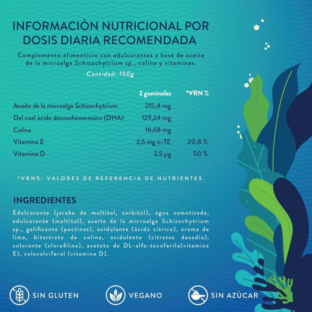 - Omega 3 (DHA) de microalgas, Vitamina D, E y Colina.
