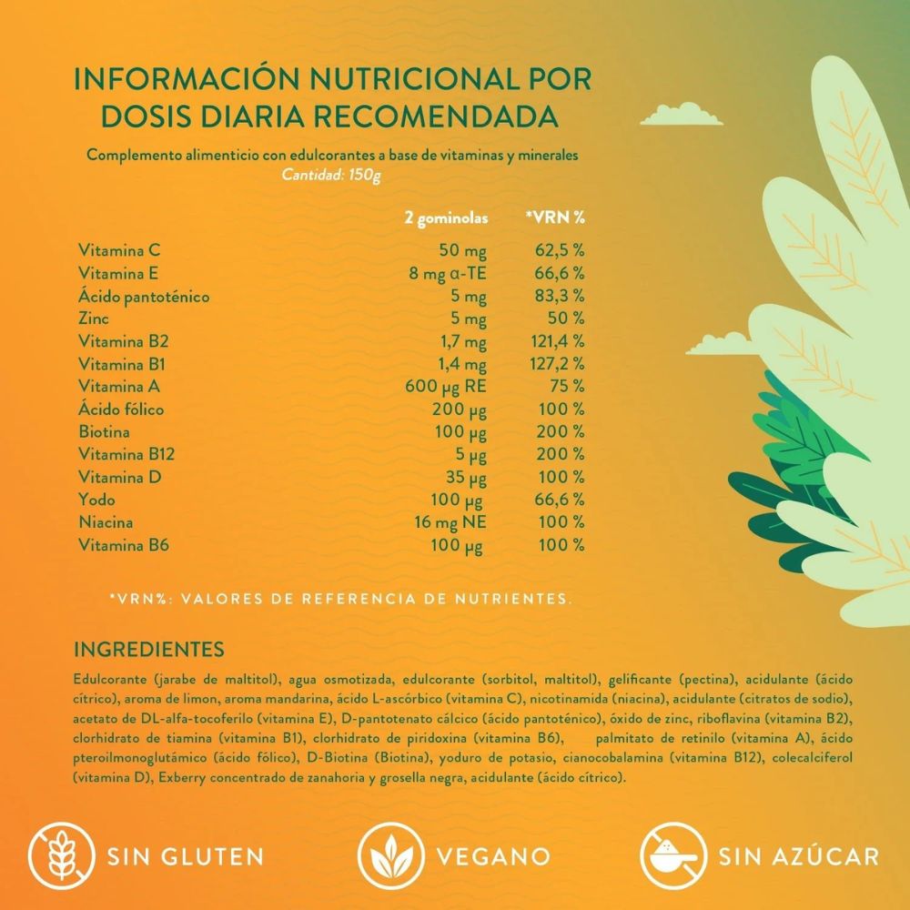 - 14 vitaminas y minerales, como el complejo B, A, C, D y E.