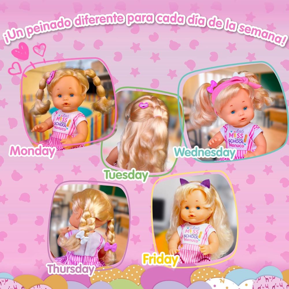 - Nenuco de 35cm, de cuerpo duro, tiene el pelo rubio largo y puedes hacerle cada día un peinado diferente para ir al cole.