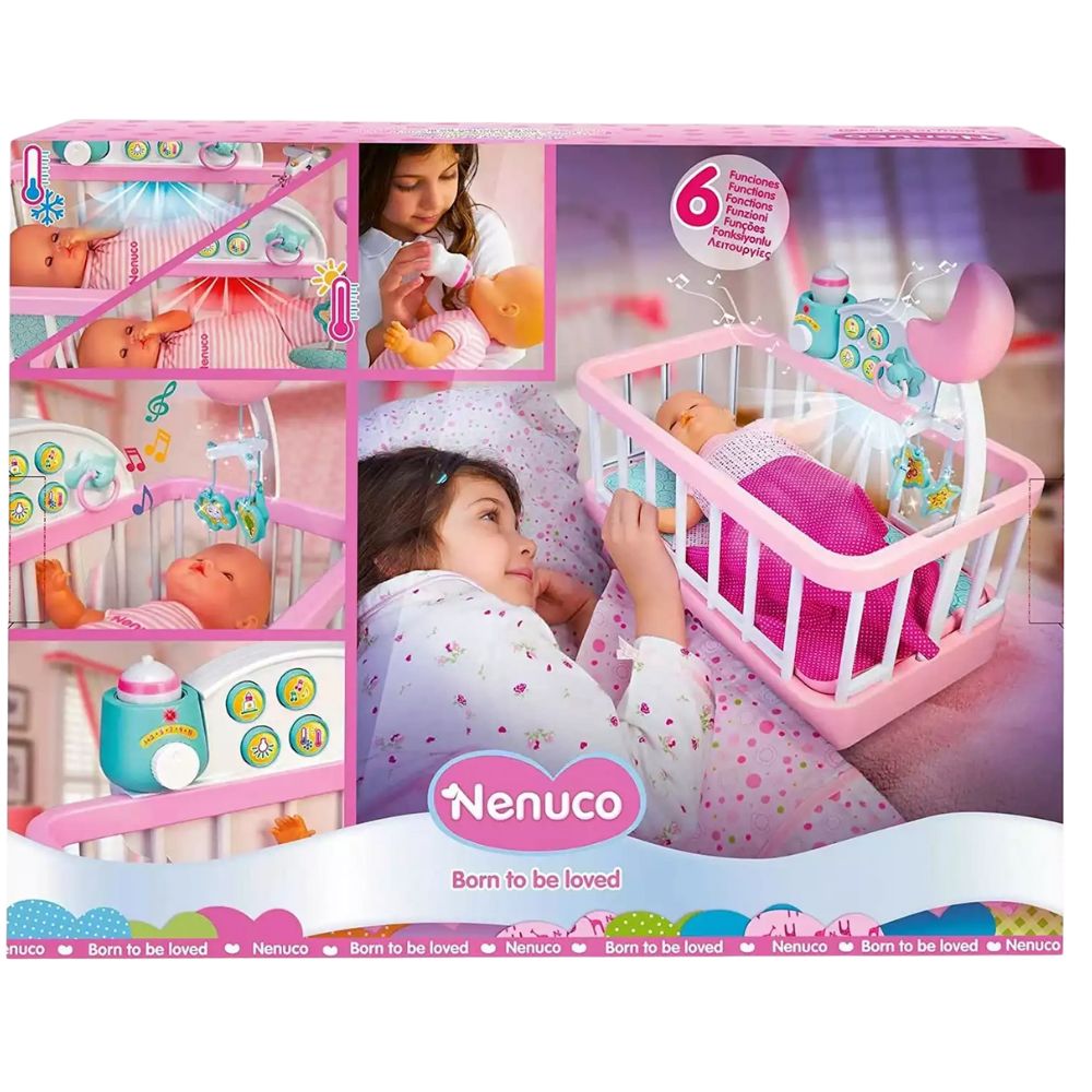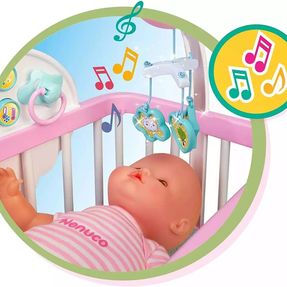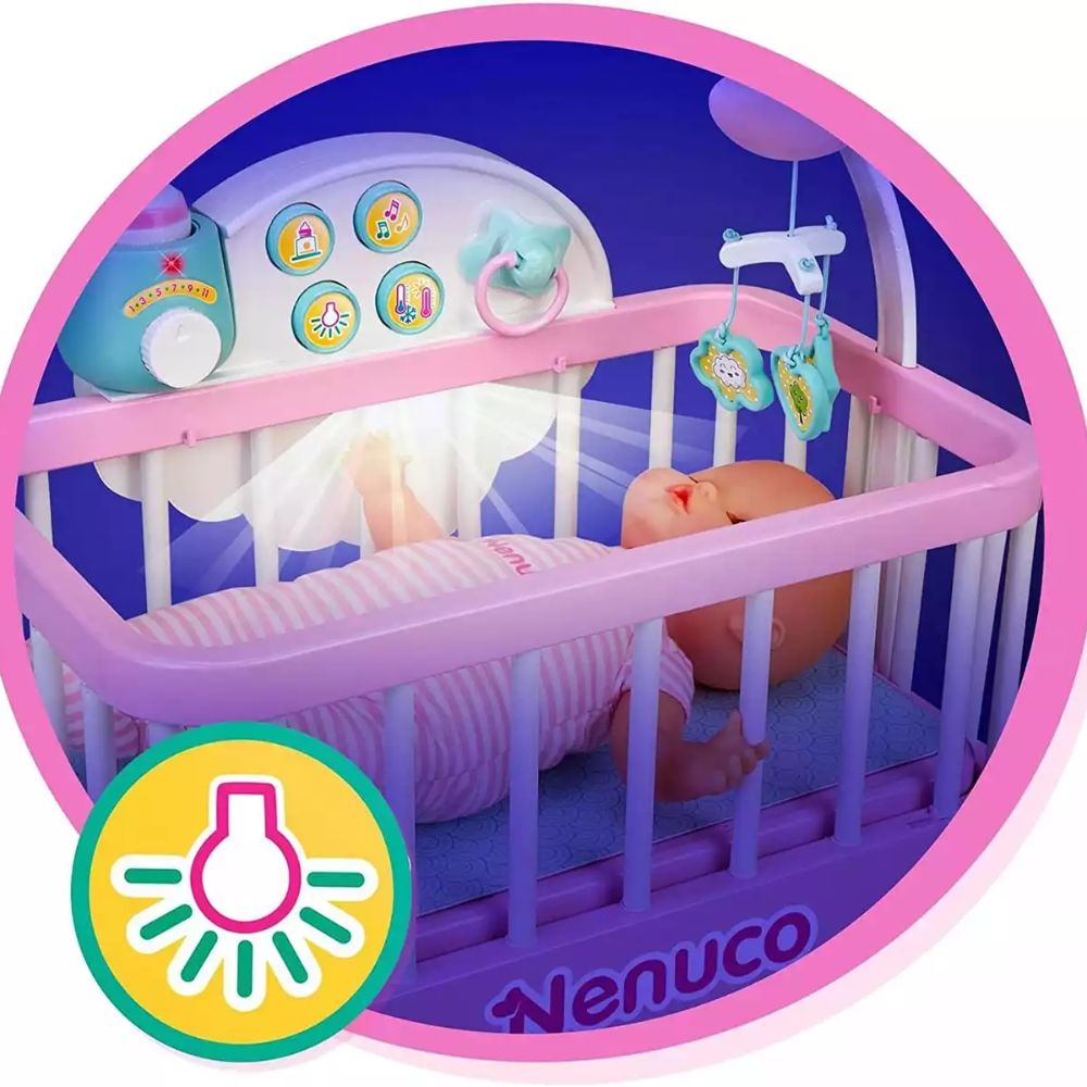 - Cuando lo pones en la cuna, Nenuco empezará a llorar… por qué? Tienes que averiguarlo! Prueba una a una todas las funciones que tiene la cuna hasta que Nenuco deje de llorar!
