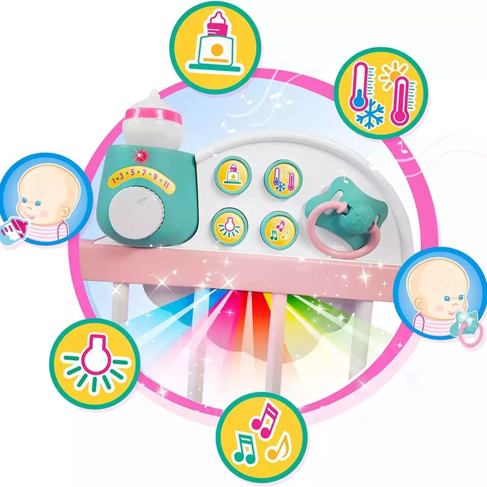- La cuna que te ayuda tiene funciones con luces y sonidos: Canción de cuna; calentador de biberones con luz; Calefacción central (línea de leds encendidos en color rojo o azul); y luz nocturna (línea de LED).