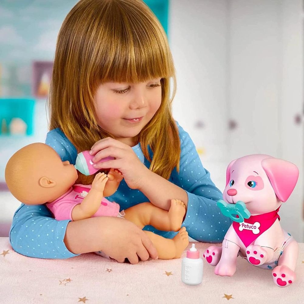 - Petuco, es un bonito perro de color rosa y grandes orejas, con las patas artículadas y frabricado en vinilo. Tiene un pañal y un bonito pañuelo en su cuello.