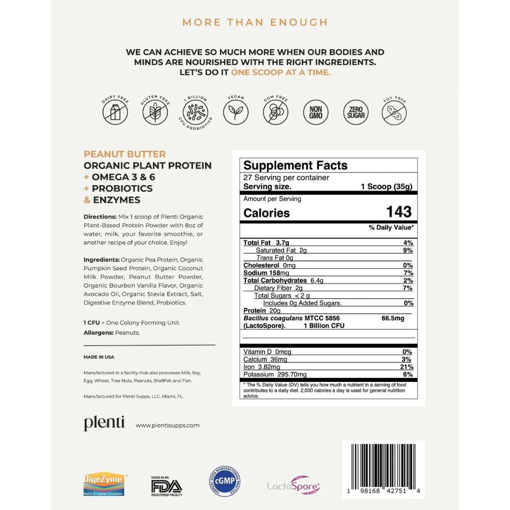 La proteína vegetal sabor a Peanut Butter de plenti está hecha con solo 8 ingredientes orgánicos, sin químicos, colorantes, o sabores artificiales*.